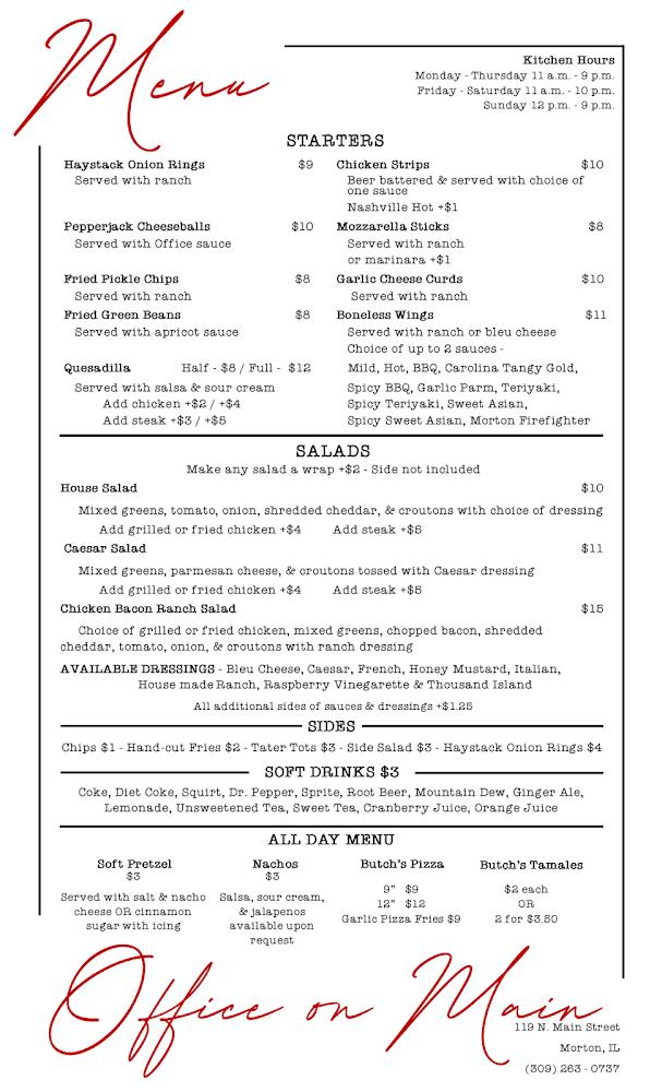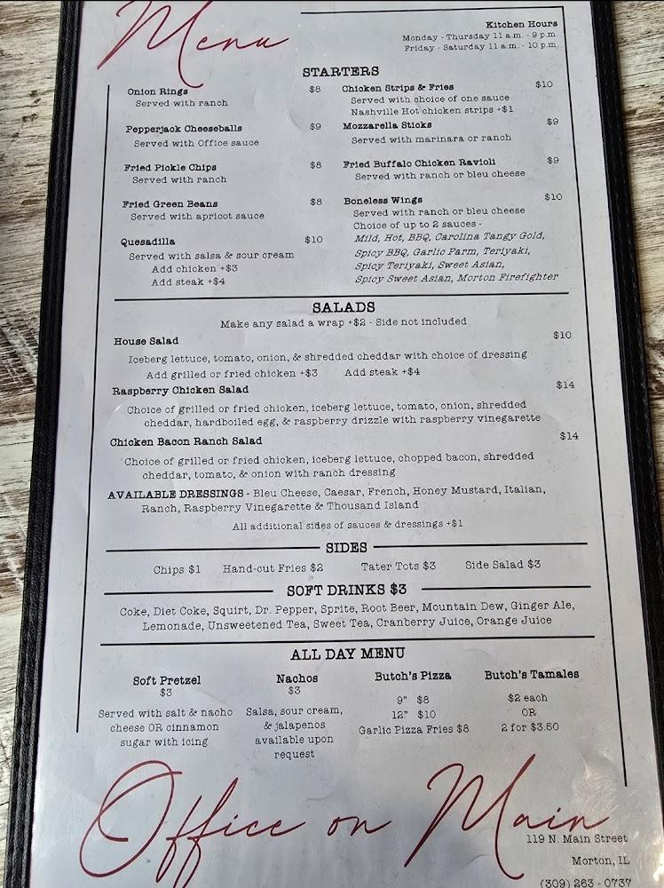 Welcome to Office on Main, your go-to destination on 119 N Main St, Morton, IL, where good food meets a lively atmosphere. Enjoy a delectable range of grilled dishes, local specialties, and excellent cocktails in a relaxed, family-friendly environment. With affordable prices and popular happy hour promotions, it’s perfect for a casual lunch, dinner, or solo dining. Our amenities include a spacious terrace, takeout, delivery, and wheelchair-accessible features. Join us for karaoke, live music, or to catch your favorite sports events, all while savoring a great selection of beers and spirits. Experience a delightful culinary outing at Office on Main!