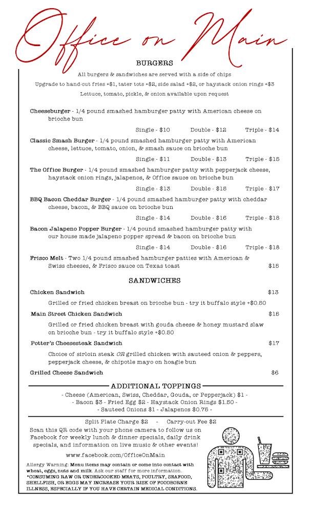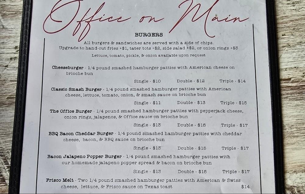 Office on Main offers a diverse menu packed with local favorites. Highlights include the smashing burgers and savory cheese steaks. Classic appetizers like wings and spicy cheese balls prepare diners for the main courses.